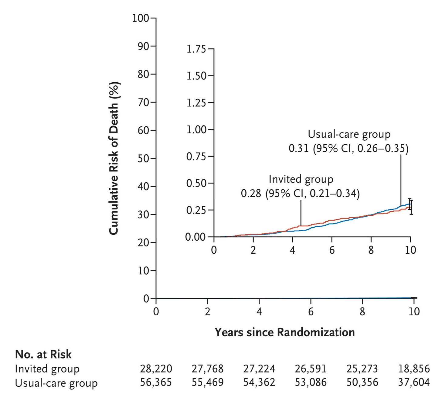 This trial didn’t show much of a difference in likelihood of dying between the groups, or, in other words, it showed that inviting people to undergo a colonoscopy doesn’t seem to save lives:
