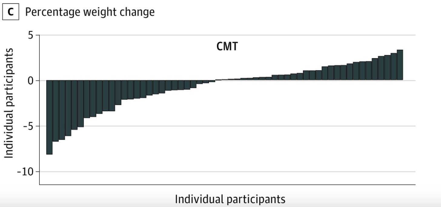 They broke down changes in weight by individual participant, which you can see below. Each bar represents an individual person’s weight loss (bar going down) or weight gain (bar going up).