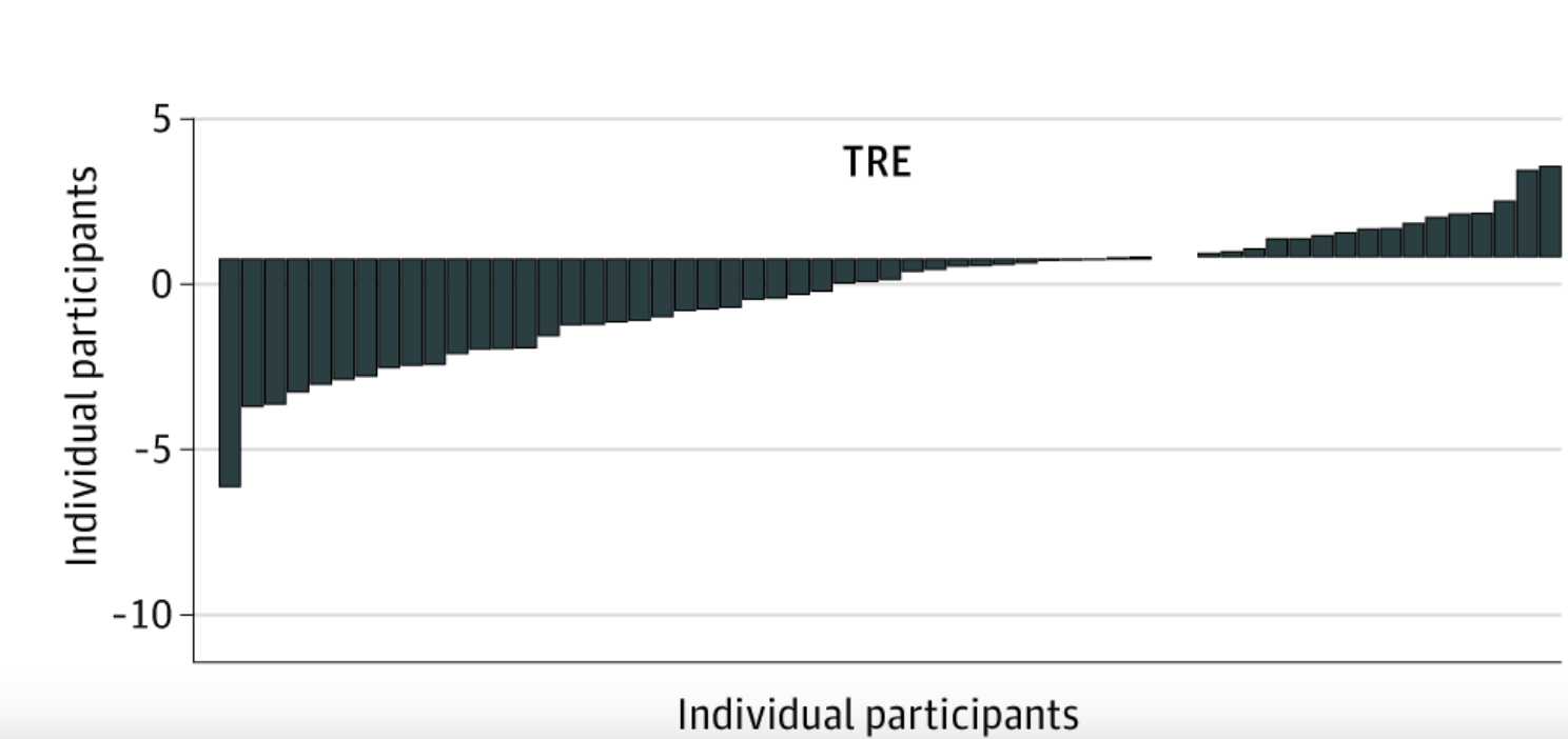 You’d see a similar graphic pattern with any diet adjustment - going plant based, going low carb, not eating after 6pm, cutting portion size by 20% - some people will be successful and some people won’t.